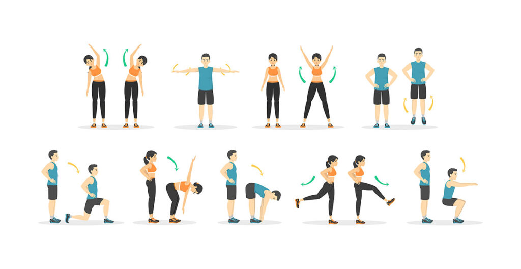3. Calentamiento dinámico: Este tipo de calentamiento implica movimientos activos y controlados que involucran una mayor amplitud de movimiento. Por ejemplo, se pueden realizar estocadas dinámicas, giros de cadera y movimientos de brazos para aumentar la flexibilidad y la coordinación.
